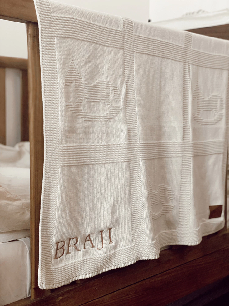 Opciones de colores de bordado para esta manta: rosa viejo, celeste, gris claro, gris oscuro, beige.